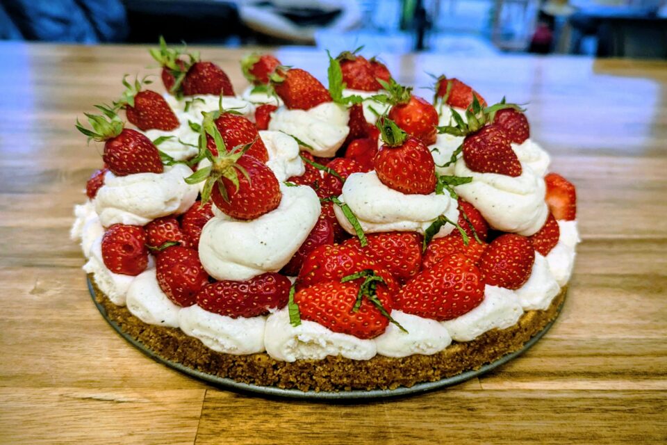 - Couper les fraises et les disposer dessus.Parsemer de menthe ciselée.